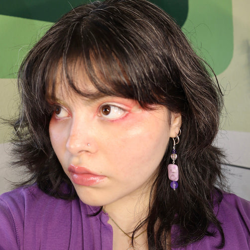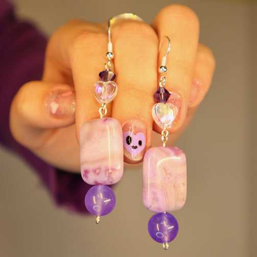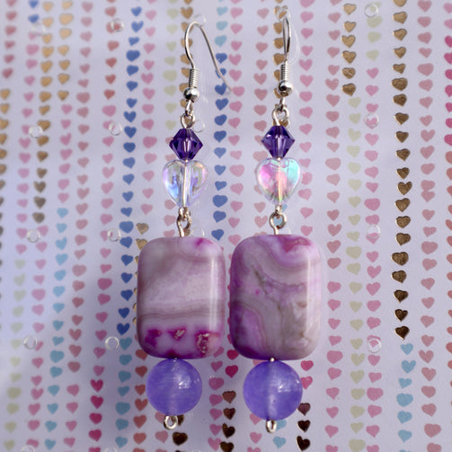 Made with amethyst rectangle beads, glass coned beads, acrylic heart beads, and dyed purple quartzite beads. Lightweight.