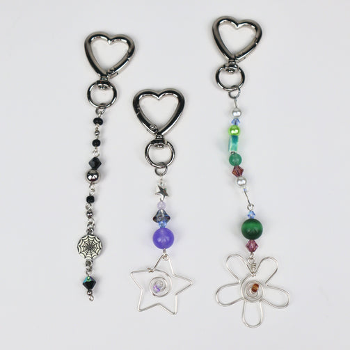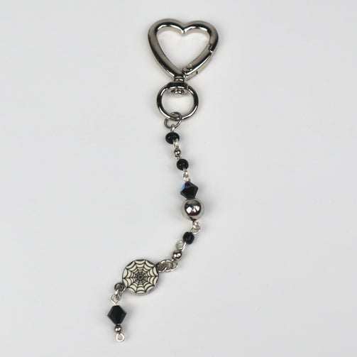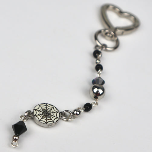 Made with glass, metallic beads, spider web charms and Artistic wire, stainless steel heart hardware.