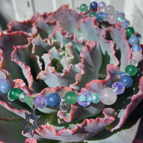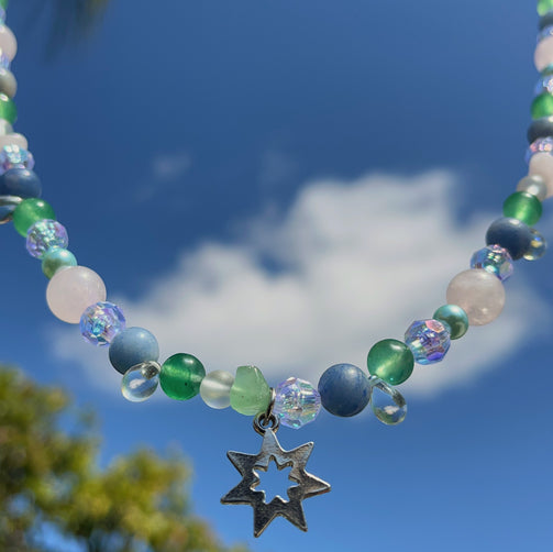 The e4rth 4ngel necklace is a dreamy beaded necklace, paired with a star charm. It features blue aventurine chips and round beads, green aventurine chips and round beads, rose quartz chips and round beads, holographic round beads and teardrop beads, along with a few other filler beads.