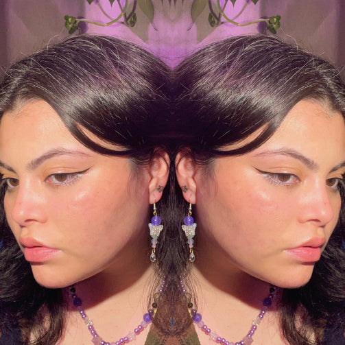 Meditation Garden earrings hold glass, holographic butterfly charms, along with green aventurine and quartzite stones. Green aventurine is known as the “Stone of Opportunity,” as it helps you attract luck. Not only does the stone attract luck, it highlights stagnant cycles in your life and leads a clearer pathway towards growth. Quartzite stones aid positive changes that prevent you from slipping back into old states after uplifting changes. It is a regulator of change.