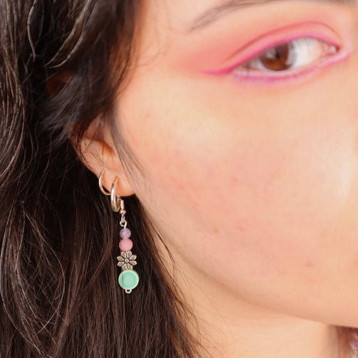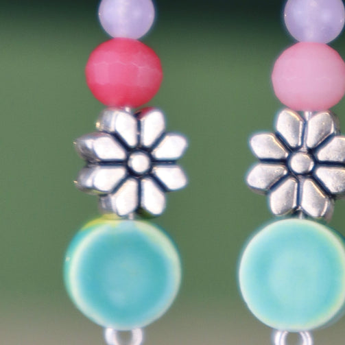 Made with green clay beads, silver flower beads, pink acrylic beads and lavender dyed quartzite beads. Earring hooks made with .925 silver (hypoallergenic).