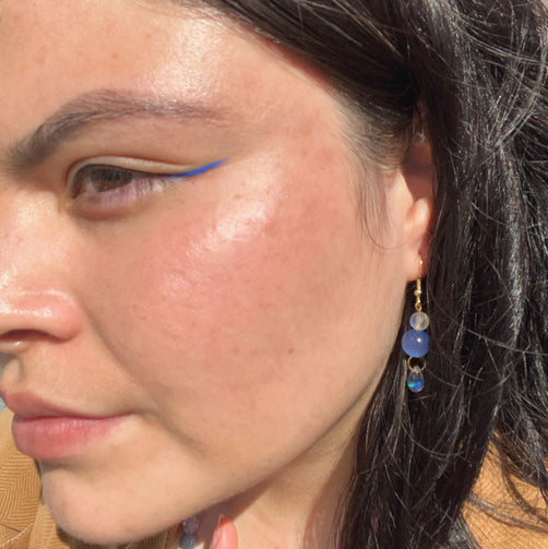 The Storm earrings are classic and timeless pieces to add to your collection. They feature a 10mm blue cat eye bead, along with a clear and blue lightning bead sitting atop the storm's raindrops.